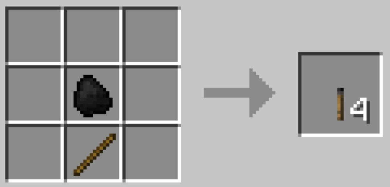 Una vez tengas palo y carbón, en la mesa de crafteo colocas el carbón en la casilla central y el palo justo debajo. El resultado de esta receta son cuatro antorchas normales por cada combinación de un palo + un carbón.